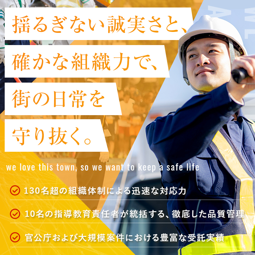 NSK GROUP株式会社は、2015年(平成27年)の設立以来、高知県を拠点に「安全」のプロフェッショナルとして歩んできました。 私たちが大切にしているのは、「we love this town, so we want to keep a safe life (この街が好きだから、安心できる暮らしを守りたい)」という想いです。 私たちが提供するのは、単なる「警備」という作業ではありません。 その場所を訪れる人々や、そこで働く方々が、不安を感じることなく日常を過ごせる 「安心な環境」そのものをお届けすることを使命としています。